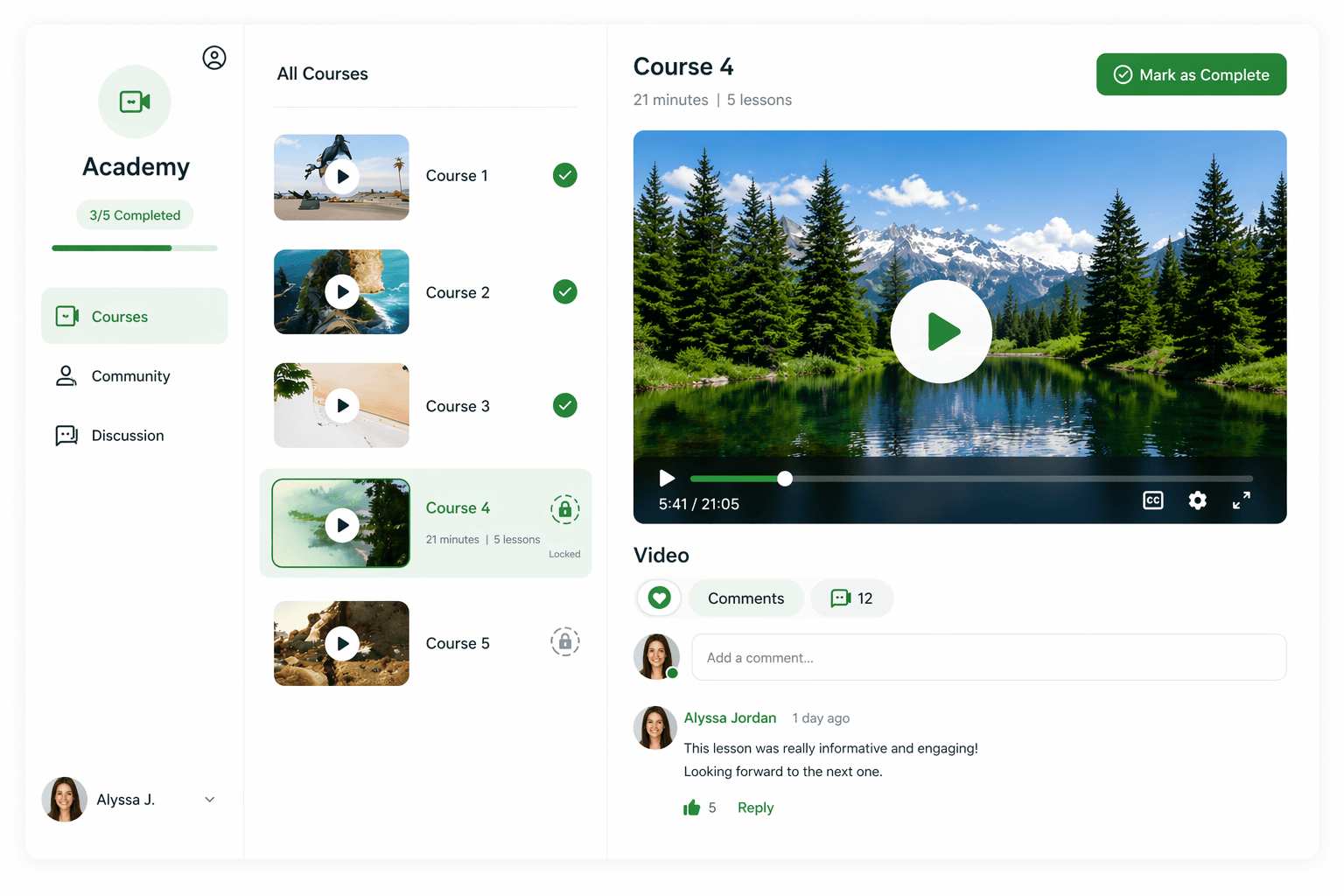 Courses with lessons, modules, and member progress