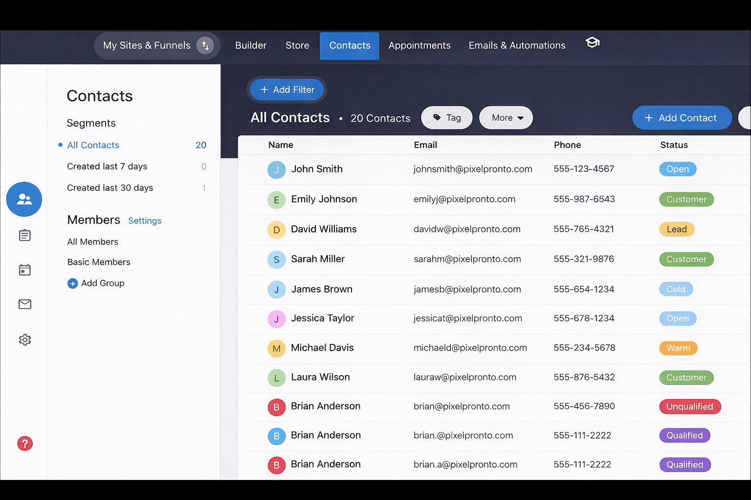 Set up once, then everything runs together — website, funnels, bookings, CRM, email, and payments.